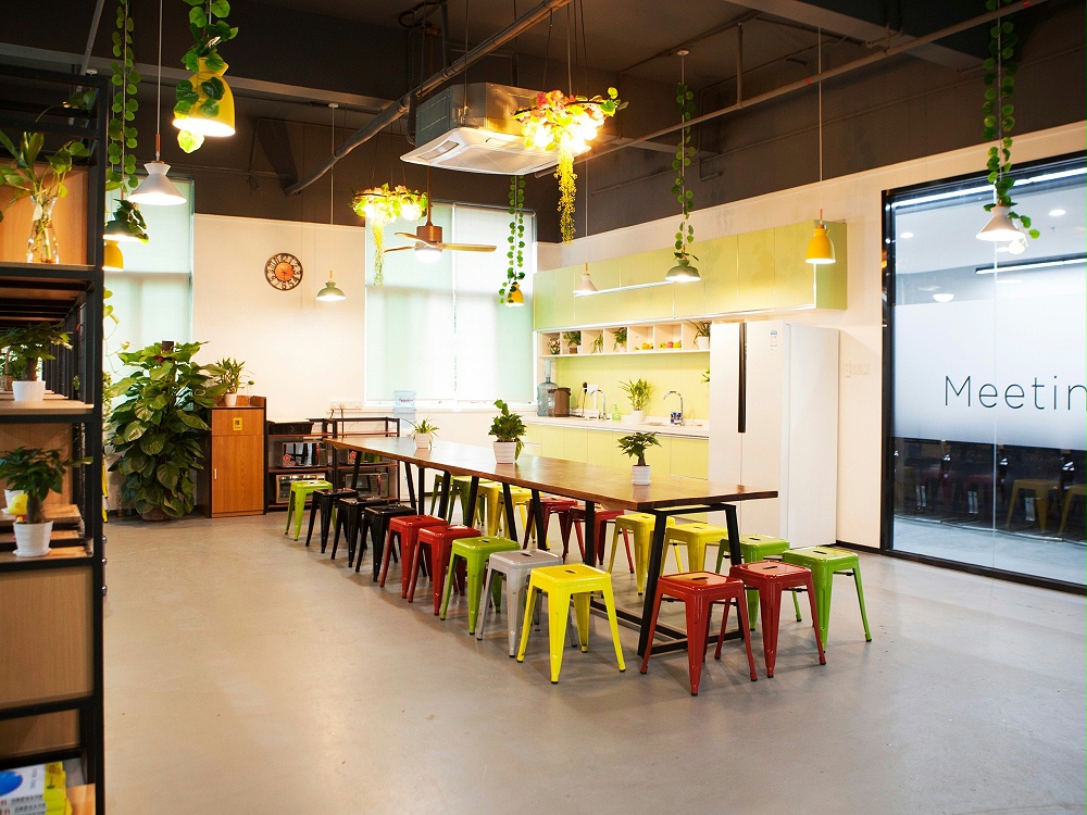 以绿色森林氧吧为主题,书架以及桌椅全部采用木质材料,吊灯也加入绿植装饰,营造“养眼” 的清新文艺感。以格子书架作为隔断,把书吧与开放办公区区分开,极大地增加了办公区的丰富性。年轻,清爽,舒适,这是不见不散办公空间设计的关键词。